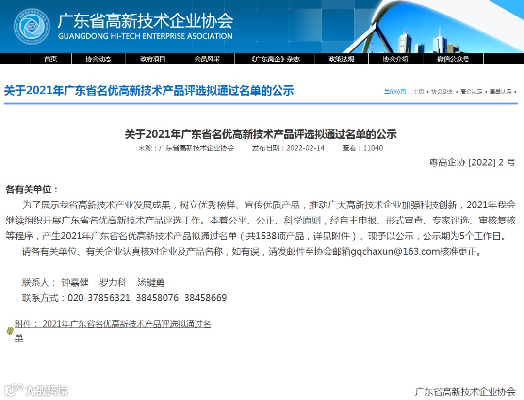 为了展示我省高新技术产业发展成果,树立优秀榜样、宣传优质产品,推动广大高新技术企业加强科技创新,2021年我会继续组织开展广东省名优高新技术产品评选工作。本着公平、公正、科学原则,经自主申报、形式审查、专家评选、审核复核等程序,产生2021年广东省名优高新技术产品拟通过名单(共1538项产品,详见附件)。现予以公示,公示期为5个工作日。