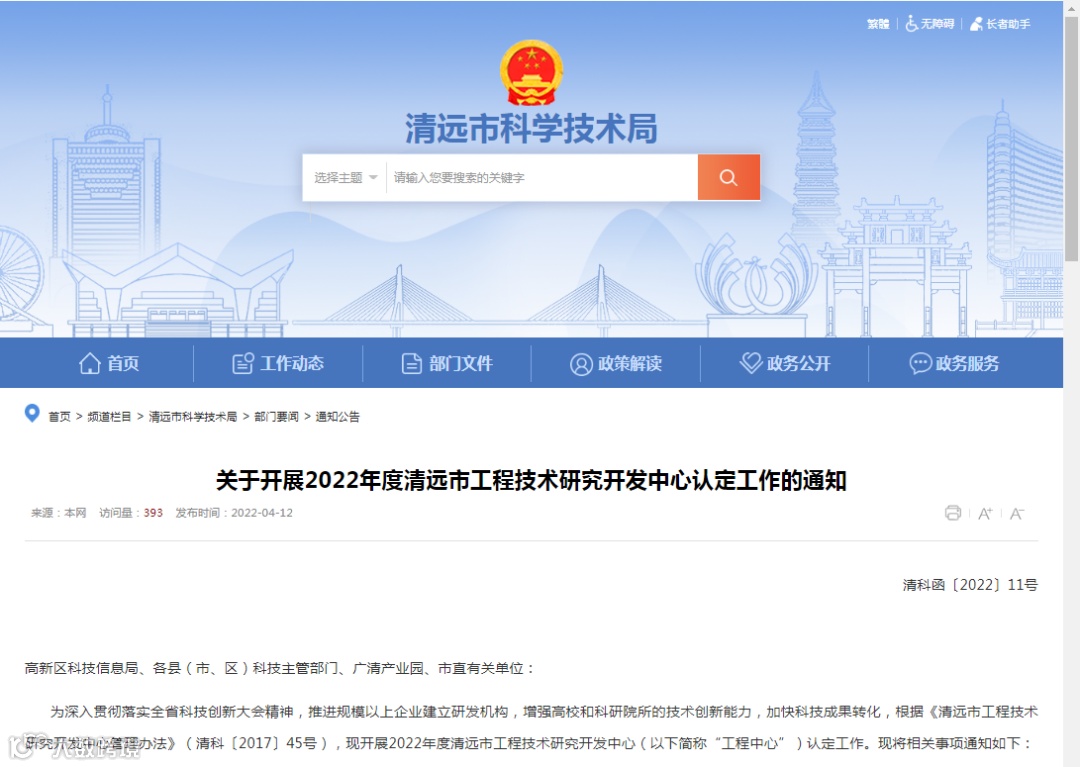 为深入贯彻落实全省科技创新大会精神,推进规模以上企业建立研发机构,增强高校和科研院所的技术创新能力,加快科技成果转化,根据《清远市工程技术研究开发中心管理办法》(清科〔2017〕45号),现开展2022年度清远市工程技术研究开发中心(以下简称“工程中心”)认定工作。现将相关事项通知如下: