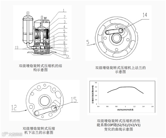 技术要点:通过合理配置双级增焓旋转式压缩机压缩工作腔的排气口面积与压缩工作腔容积的比值,减小压缩机排气阻力损失、提高压缩机容积效率