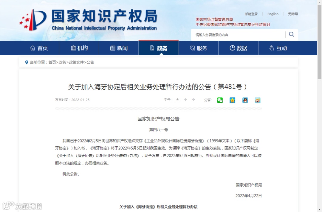 我国已于2022年2月5日向世界知识产权组织交存《工业品外观设计国际注册海牙协定》(1999年文本)(以下简称《海牙协定》)加入书,《海牙协定》将于2022年5月5日起对我国生效。为保障《海牙协定》的生效实施,国家知识产权局制定《关于加入〈海牙协定〉后相关业务处理暂行办法》,现予发布,自2022年5月5日起施行。外观设计国际申请的申请人可以按照本办法的规定,办理相关业务。