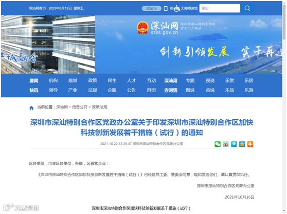 【政策名称】《深圳市深汕特别合作区加快科技创新发展若干措施(试行)