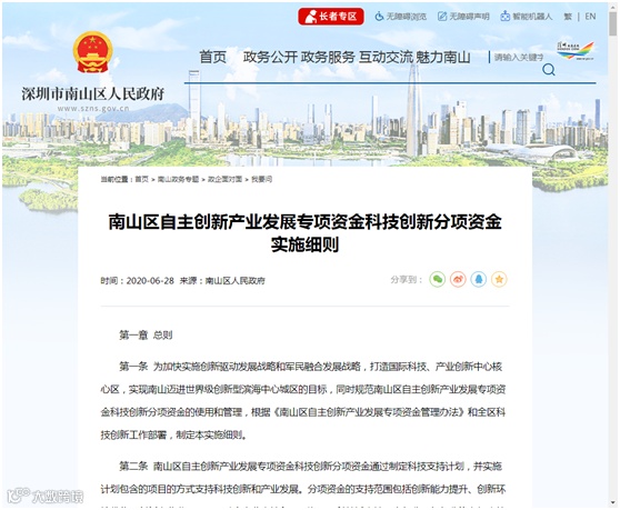 【政策名称】南山区自主创新产业发展专项资金科技创新分项资金实施细则