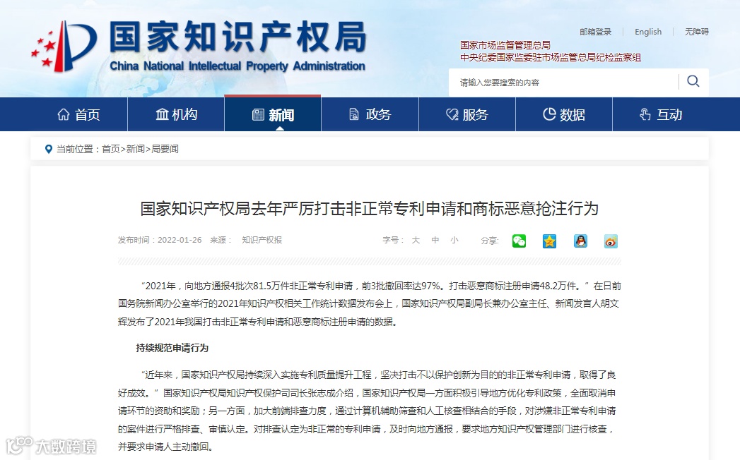 “2021年,向地方通报4批次81.5万件非正常专利申请,前3批撤回率达97%。打击恶意商标注册申请48.2万件。”在日前国务院新闻办公室举行的2021年知识产权相关工作统计数据发布会上,国家知识产权局副局长兼办公室主任、新闻发言人胡文辉发布了2021年我国打击非正常专利申请和恶意商标注册申请的数据。