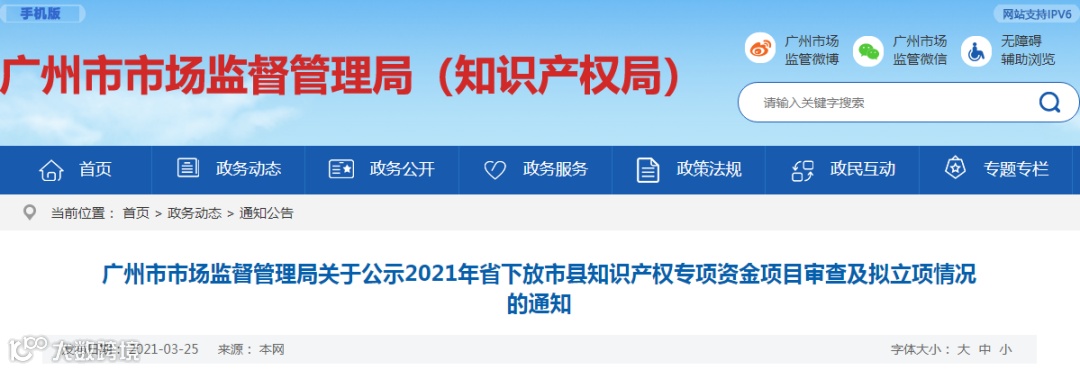 根据《广东省促进经济高质量发展专项资金(市场监督管理)管理办法》和《广州市市场监督管理局关于印发<2021年省下放市县知识产权专项资金项目申报指南>的通知》有关要求,我局对申报的“知识产权优势企业项目”进行了审核,对申报的“广东省高校知识产权运营促进工程项目”和“国企知识产权高质量发展项目”进行了资格审查和专家评审,现将审核结果、专家评分结果、拟立项情况及资金拟分配方案予以公示,公示时间为2021年3月25日—3月31日。