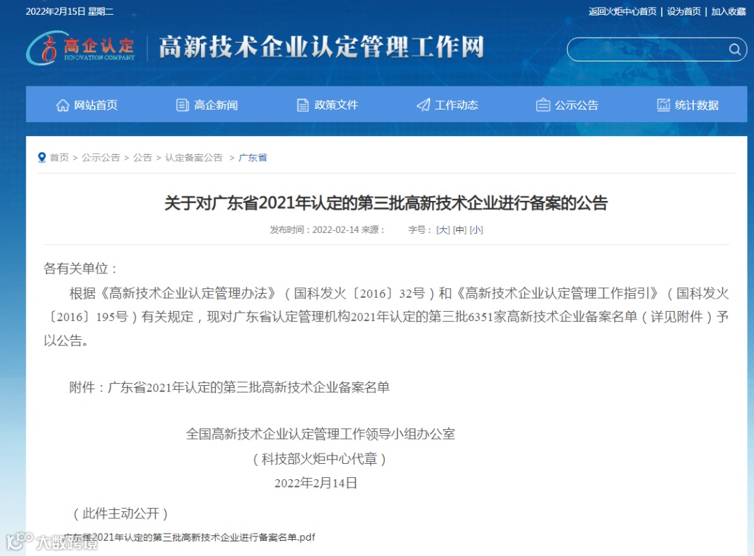 根据《高新技术企业认定管理办法》(国科发火〔2016〕32号)和《高新技术企业认定管理工作指引》(国科发火〔2016〕195号)有关规定,现对广东省认定管理机构2021年认定的第三批6351家高新技术企业备案名单(详见附件)予以公告。
