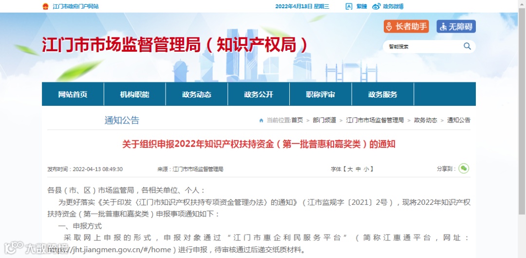 为更好落实《关于印发〈江门市知识产权扶持专项资金管理办法〉的通知》(江市监规字〔2021〕2号),现将2022年知识产权扶持资金(第一批普惠和嘉奖类)申报事项通知如下:
