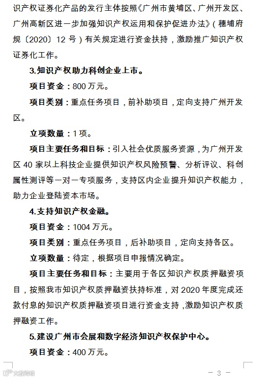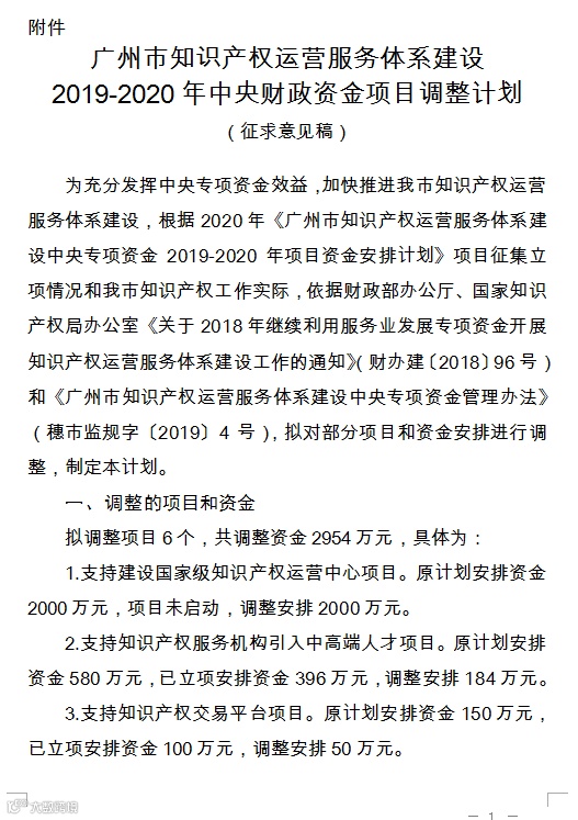 2018年,我市获批知识产权运营服务体系建设重点城市,并获得中央财政资金2亿元支持。根据财政部办公厅、国家知识产权局办公室《关于2018年继续利用服务业发展专项资金开展知识产权运营服务体系建设工作的通知》(财办建〔2018〕96号)和财政部《关于印发〈服务业发展资金管理办法〉的通知》(财建〔2019〕50号)等文件要求和我市知识产权运营服务体系建设实际,经市人民政府批准,我局于2019年12月10日印发了《广州市知识产权运营服务体系建设中央专项资金2019-2020年项目资金安排计划》(穗市监促〔2019〕425号),2019-2020年我市计划安排知识产权运营服务体系建设中央财政支持资金12837.11万元。2020年我局全面展开相关项目的征集和实施,截至2020年底,已累计立项项目15个87项,立项资金10283.11万元。由于部分项目未按计划完成立项,个别项目立项并拨付资金后未正式展开实施,我局制定了《广州市知识产权运营服务体系建设2019-2020年中央财政资金项目调整计划(征求意见稿)》,现公开征求公众意见,欢迎社会各界提出意见和建议,并于2021年1月15日前将意见和建议通过以下途径提交:电子邮件:IPOxw@gz.gov.cn,联系电话:020-83228328。个人意见请同时提供姓名、联系电话、身份证号码;单位意见请同时提供单位名称、法人姓名、联系电话、经办人姓名、联系电话。