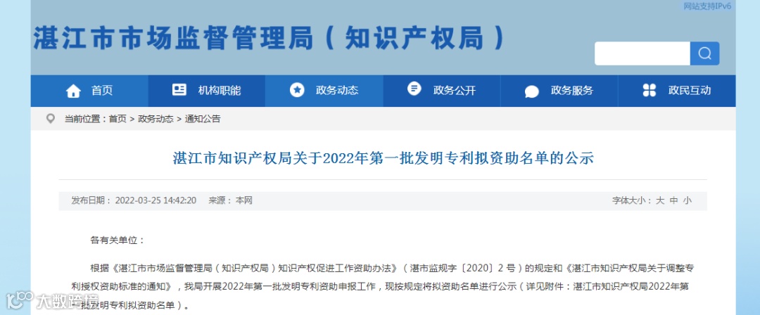根据《湛江市市场监督管理局(知识产权局)知识产权促进工作资助办法》(湛市监规字〔2020〕2 号)的规定和《湛江市知识产权局关于调整专利授权资助标准的通知》,我局开展2022年第一批发明专利资助申报工作,现按规定将拟资助名单进行公示(详见附件:湛江市知识产权局2022年第一批发明专利拟资助名单)。