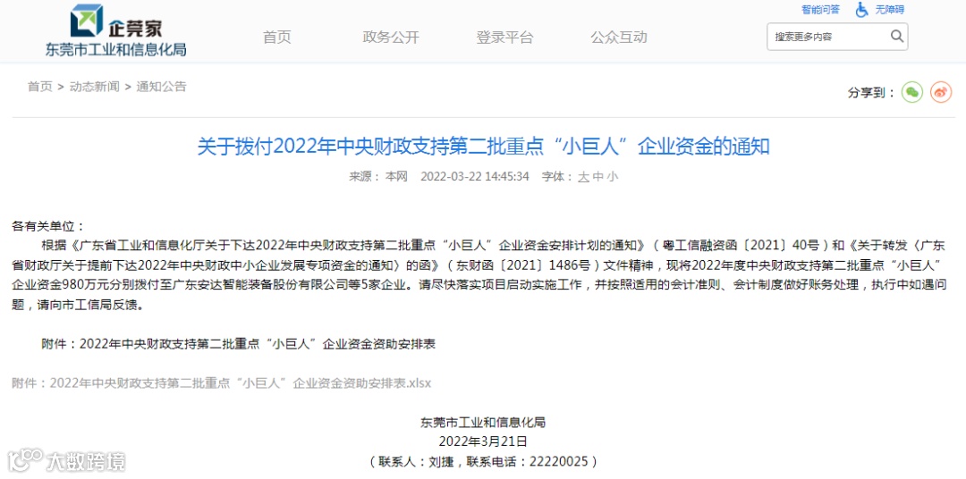 根据《广东省工业和信息化厅关于下达2022年中央财政支持第二批重点“小巨人”企业资金安排计划的通知》(粤工信融资函〔2021〕40号)和《关于转发〈广东省财政厅关于提前下达2022年中央财政中小企业发展专项资金的通知〉的函》(东财函〔2021〕1486号)文件精神,现将2022年度中央财政支持第二批重点“小巨人”企业资金980万元分别拨付至广东安达智能装备股份有限公司等5家企业。请尽快落实项目启动实施工作,并按照适用的会计准则、会计制度做好账务处理,执行中如遇问题,请向市工信局反馈。