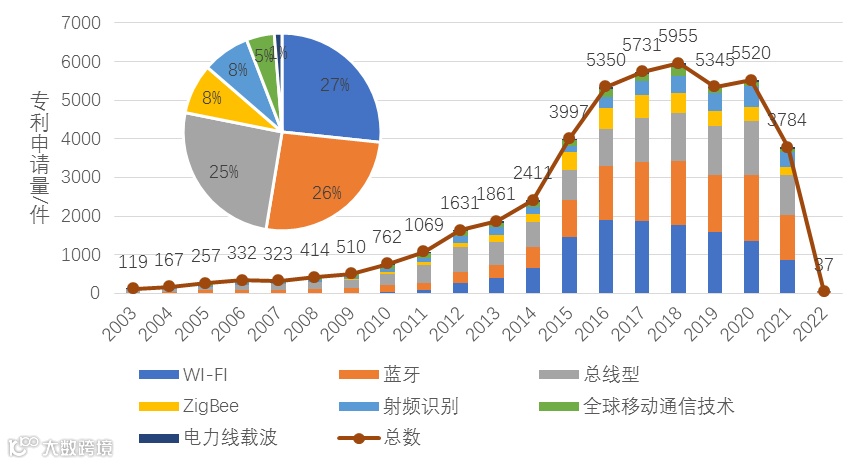 从图1申请趋势上看,专利申请量在2016年之前是呈现稳步增长的趋势,在2016年之后专利申请量在5,000件到6,000件之间波动,2018年达到申请量顶峰5,955件(因专利申请存在审查周期,因此2021年和2022年的实际数据比当前数量要多)。从技术分支趋势上看,2003年到2009年属于智能家电组网技术的萌芽期,领域研究主要集中在总线型。2009年到2016年是高速发展期,在这一时期很多技术分支都有很多的专利申请,其中Wi-Fi和蓝牙在这期间专利申请量大幅上涨。2016年至今年申请量保持动态稳定,此时组网技术已经相对成熟,专利申请量增长速度趋向稳定,在这期间越来越多的专利是将多种技术融合组网,使智能家电的网络连接更加稳定。
