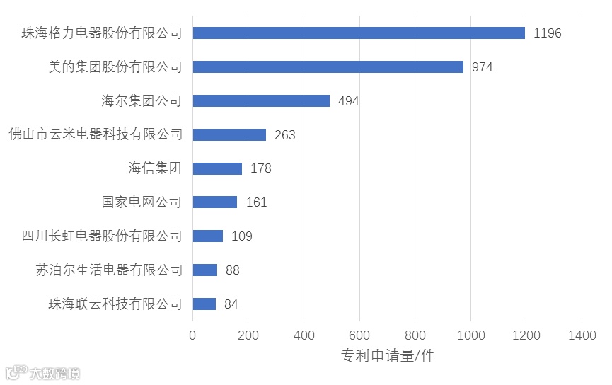 图2 表示国内申请量前十的申请人排名。其中格力、美的、海尔、海信、长虹以及苏泊尔是国内传统大牌家电企业,它们紧跟时代发展,在智能家电领域投入大量的研发,其中格力的专利申请量为1,196件,排名第一;美的专利申请量为974件,排名第二;海尔的专利申请量为494件,排名第三;海信的专利申请量为178件,排名第五;长虹的专利申请量为109件,排名第7;苏泊尔的专利申请量为88件,排名第9。同时还有佛山云米、珠海联云新兴互联网企业上榜。佛山云米主要经营家庭物联网家电研发与销售,并为小米代工过家电产品,它以263件专利申请量位列第四。珠海联云是由珠海格力电器的信息化、人工智能、物联网产业整合而成,是格力的全资子公司,它以84件专利申请量位列第十。