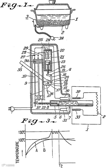 第一个阶段:萌芽期(1955-1976年)。该阶段电饭煲全球专利申请量几乎没有明显变化,该时期的电饭煲以机械式电饭煲为主,加热位置主要是底面加热,即将电热元件设置在底盘。如东芝1964年公开的专利文献GB959065A提供了一种塞式自动电饭煲温度控制装置,其设置了一个活塞装置(如图2的23所示),以铜或铝作为活塞的高导热材料管,内置膨胀液体(如图2的24所示),利用膨胀液体(如硅油)的热膨胀效应来驱动活塞的运动,从而达到断开或闭合触点来控制温度的效果。
