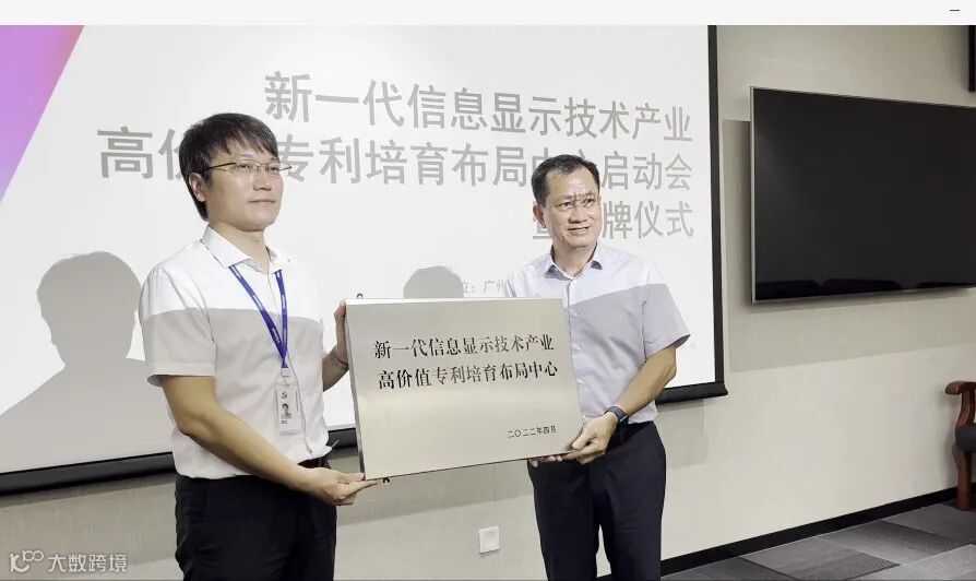 广州市市场监督管理局副局长蓝伟宁、增城区市场监督管理局局长张应泉一行在现场参观国显展厅并进行交流后,蓝伟宁副局长向国显公司总经理郑红授予布局中心牌匾,“新一代信息显示技术产业高价值专利培育布局中心”正式授牌成立。