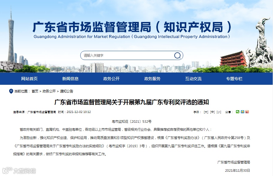 为激励创新,强化知识产权创造、保护和运用,推动高质量发展和引领型知识产权强省建设,根据《广东省专利奖励办法》(广东省人民政府令第258号)及《广东省市场监督管理局关于广东省专利奖励办法的实施细则》(粤市监规字〔2019〕3号),组织开展第九届广东专利奖评选工作。请根据《第九届广东专利奖申报指南》的有关要求,做好广东专利奖的申报和推荐等有关工作。