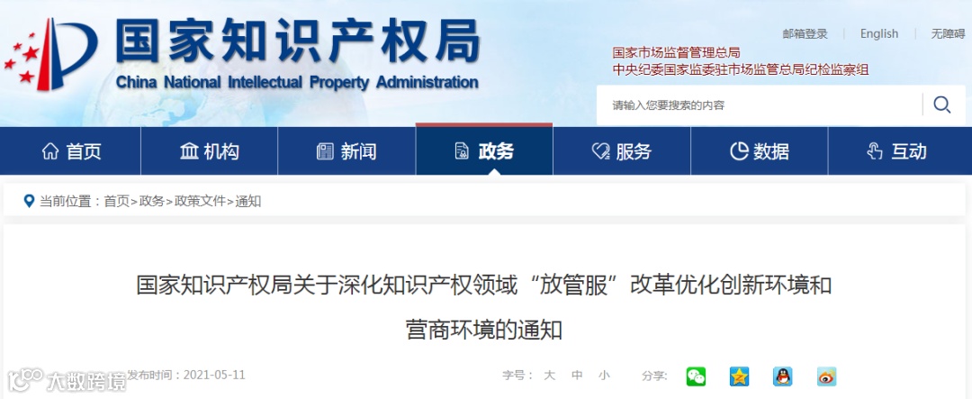 为贯彻党中央、国务院关于深化“放管服”改革的决策部署,落实《优化营商环境条例》,充分响应创新发展需要和社会公众需求,更大激发创新动力和活力,切实提高社会公众对知识产权工作的满意度,推动知识产权高质量发展,优化创新环境和营商环境,昨日,国家知识产权局印发《关于深化知识产权领域“放管服”改革优化创新环境和营商环境的通知》,共16条: