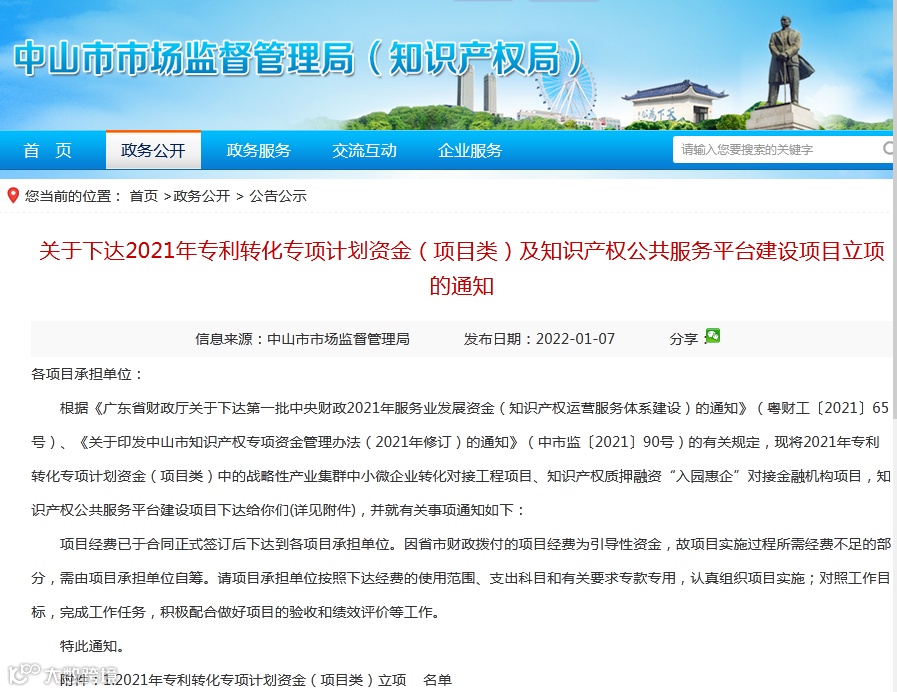 根据《广东省财政厅关于下达第一批中央财政2021年服务业发展资金(知识产权运营服务体系建设)的通知》(粤财工〔2021〕65号)、《关于印发中山市知识产权专项资金管理办法(2021年修订)的通知》(中市监〔2021〕90号)的有关规定,现将2021年专利转化专项计划资金(项目类)中的战略性产业集群中小微企业转化对接工程项目、知识产权质押融资“入园惠企”对接金融机构项目,知识产权公共服务平台建设项目下达给你们(详见附件),并就有关事项通知如下: