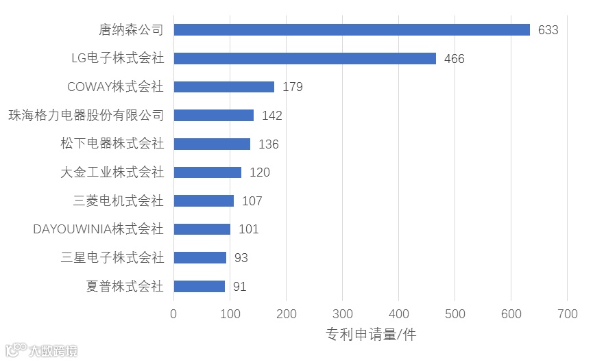 如图所示为空气净化领域的全球排名前十的申请人,韩国上榜4家,日本上榜4家,美国上榜1家,中国企业只有格力电器上榜。排名第一的是美国唐纳森公司,唐纳森公司是一家垂直整合的过滤公司,侧重于各种工业领域的空气过滤器。