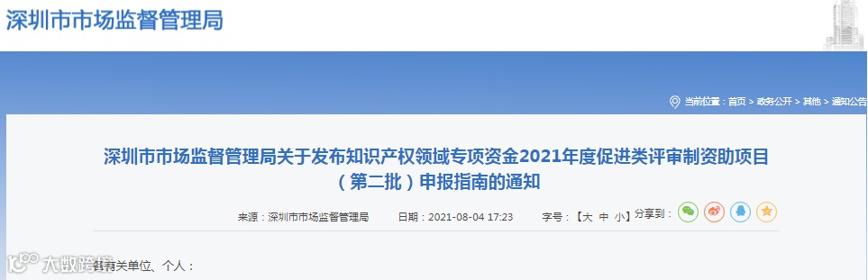 根据《深圳市市场监督管理局专项资金管理办法》(深市监规〔2020〕3号)和《深圳市市场监督管理局知识产权领域专项资金操作规程》(深市监规〔2019〕10号)等有关规定,现将深圳市市场监督管理局知识产权领域专项资金2021年度知识产权促进类评审制资助项目(第二批)申报指南予以发布,符合条件的单位、个人均可按照相关规定和申报指南的要求提交申请。