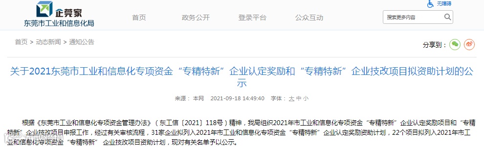 根据《东莞市工业和信息化专项资金管理办法》(东工信〔2021〕118号)精神,我局组织2021年市工业和信息化专项资金“专精特新”企业认定奖励项目和“专精特新”企业技改项目申报工作,经过有关审核流程,31家企业拟列入2021年市工业和信息化专项资金“专精特新”企业认定奖励资助计划,22个项目拟列入2021年市工业和信息化专项资金“专精特新” 企业技改项目资助计划,现对有关名单予以公示。