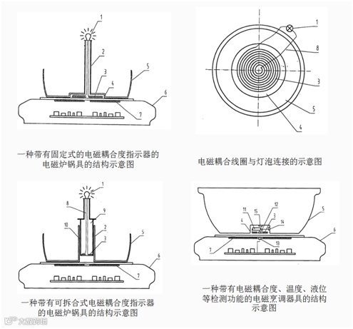 技术要点:电磁炉的烹调器具与所述电磁耦合线圈组合成一整体,既能与灯泡组成电磁耦合度指示器并做照明灯使用,又能为烹调器具的指示、检测、控制电路提供电源