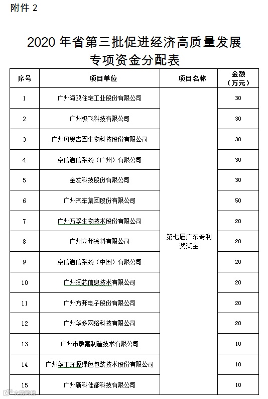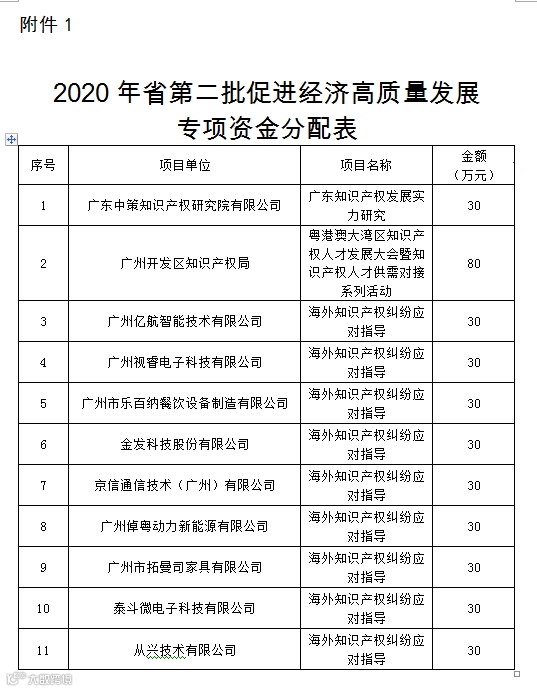 根据《广州市财政局关于转下达2020年促进经济高质量发展专项资金(第二批)的通知》(穗财商〔2020〕2号)及《广州市财政局关于转下达2020年促进经济高质量发展专项资金(第三批)的通知》(穗财商〔2020〕16号)要求,我局将第二批省级专项资金广州市11个项目380万元、第三批专项资金中广州市24个项目440万元经费转拨至各有关单位(具体单位、项目、金额详见附件)。各项目承担单位要按照省财政厅、省市场监管局、市财政局的有关要求,专款专用,加强资金管理和工作推进,并配合有关部门做好绩效考核和监督检查工作。