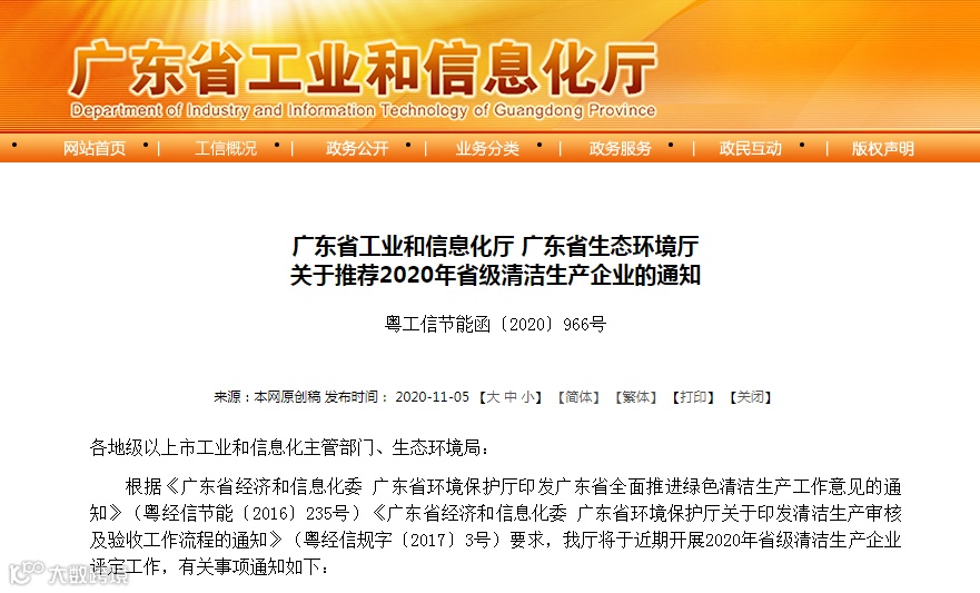 2.广东省工业和信息化厅广东省生态环境厅关于推荐2020年省级清洁生产企业的通知