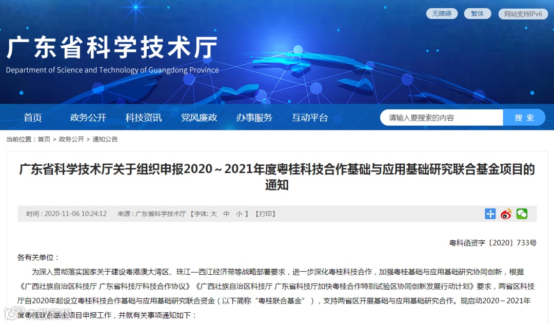 1.广东省科学技术厅关于组织申报2020~2021年度粤桂科技合作基础与应用基础研究联合基金项目的通知