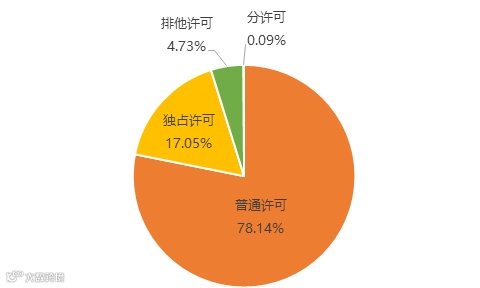 从许可类型来看,2021年经国家知识产权局备案的许可行为以普通许可为主,占78.14%,独占许可17.05%,排他许可是4.73%,还有0.09%的分许可。