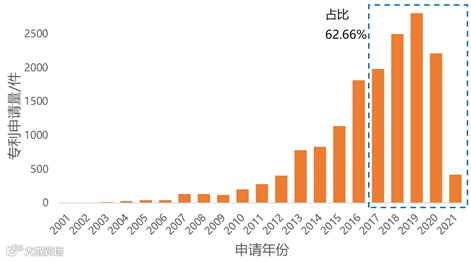 从专利申请年份看,2021年许可备案涉及的专利以近几年提交的专利为主,比如2017-2021年申请的专利量占62.66%以上,但其申请日最早可到2001年,少量专利在保护期届满前甚至不足1个月仍在进行专利实施许可及备案。有可能该技术已经成熟应用在被许可人的产品中,虽然专利技术保护期所剩无几,但仍属获法律保护的技术而继续采取被许可实施的方式。