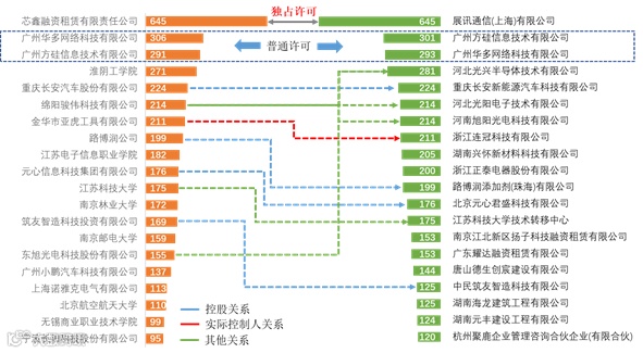 总体看,专利许可类型主要以普通许可为主,但对于有一定实力的企业来说,专利实施许可仍以其控股子母公司、实际控股人关系或其他关联关系公司之间的相互许可为主,比如排在前20位专利许可量的企业许可与被许可之间。