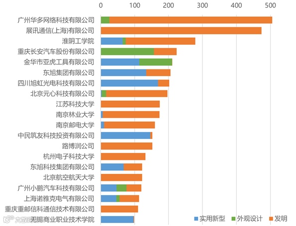 而且从许可的专利类型来看各有特点。比如华多网络、展讯通信、北京元心科技有限公司(下称元心科技)、路博润公司(下称路博润)、重庆重邮信科通信技术有限公司,均属新一代信息或通信技术领域,其专利主要以发明专利为主,专利保护客体多是系统产品或方法;而重庆长安汽车股份有限公司和金华市亚虎工具有限公司则以外观设计专利为主,多是汽车整体/局部、工具工作操作台等外观形状;金华市亚虎工具有限公司、东旭集团有限公司(东旭科技)、四川旭虹光电科技有限公司、中民筑友科技投资有限公司等以实用新型为主。科研院校方面,淮阴工学院、江苏科技大学、南京林业大学、南京邮电大学、杭州电子科技大学、北京航空航天大学涉及许可的专利类型几乎都是发明专利,而无锡商业职业技术学院则几乎是实用新型专利。