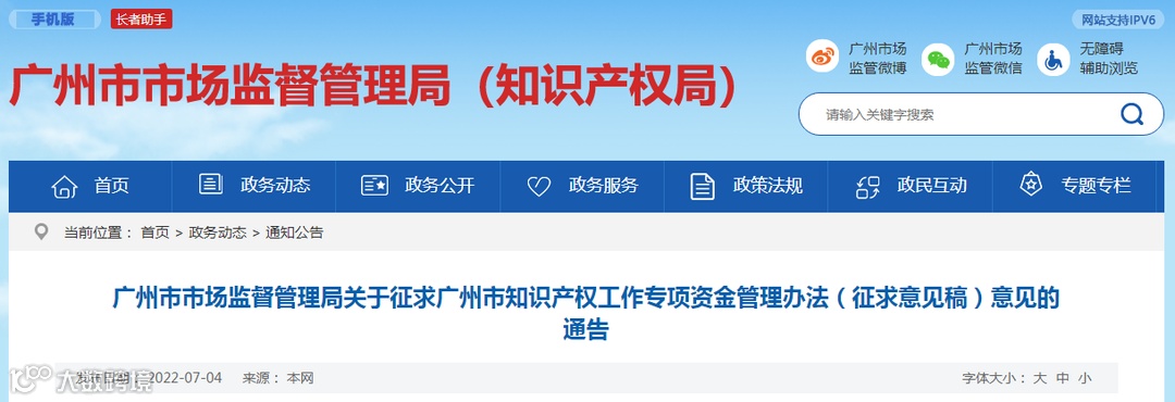 为贯彻落实国家知识产权战略,推动知识产权强国示范城市建设,我局修订了《广州市知识产权工作专项资金管理办法(征求意见稿)》,现向社会公众征求意见。征求意见反馈截止时间为2022年7月14日(星期四),具体途径如下: