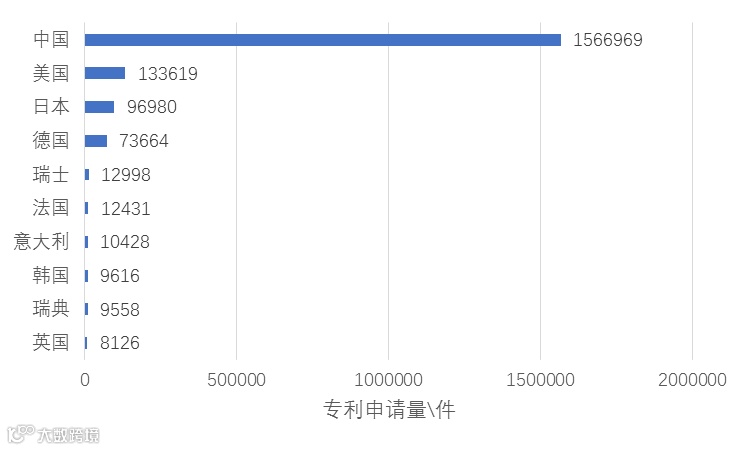 图2所示为智能制造装备产业技术在世界范围内的分布情况。由图可见,全球智能制造装备产业专利分布相对比较集中,主要分布在科技相对发达的国家和地区,而且专利申请通常是与市场发展相适应的,市场活跃的地区,其企业普遍更重视专利布局。其中,第一梯队的是中国,以1,566,969件申请数量在全球范围内遥遥领先;第二梯队为美国、日本和德国,专利申请分别为133,619件、96,980件和73,664件;第三梯队为瑞士、法国和意大利,专利申请分别为12,998件、12,431件和10,428件;第四梯队为韩国、瑞典和英国,专利申请分别为9,616件、9,558件和8,126件。此外,有101,232件通过欧洲专利局申请智能制造装备技术领域的专利,通过指定申请公开国家或进入指定国家,可以获得更大的地域范围保护。从侧面反映,目前智能制造装备产业技术相关的创新主体,已经开始就基本的专利在全球开展布局,一旦瓶颈技术得到突破,进而展开大规模应用,即可通过提前布局的专利赢得市场地位,也是国际巨头常用的专利布局策略。