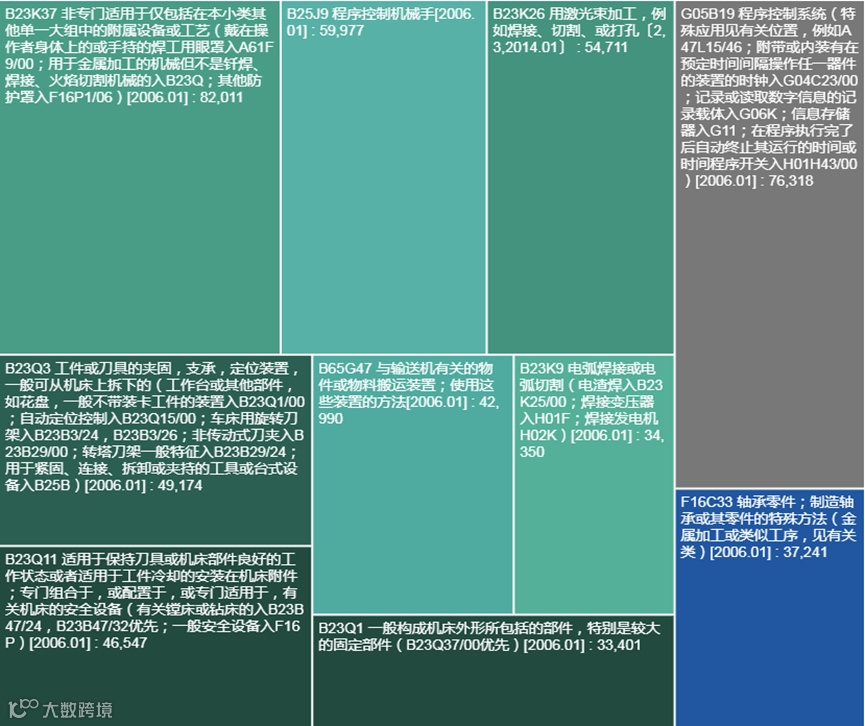 图4所示为智能制造装备产业专利的技术分布情况,可见该技术领域的研究目前主要集中在B23K37 (非专门适用于仅包括在本小类其他单一大组中的附属设备或工艺)、G05B19 (程序控制系统)、B25J9 (程序控制机械手)、B23K26 (用激光束加工,例如焊接、切割、或打孔)、B23Q3 (工件或刀具的夹固,支承,定位装置,一般可从机床上拆下的(工作台或其他部件)、B23Q11 (适用于保持刀具或机床部件良好的工作状态或者适用于工件冷却的安装在机床附件;专门组合于,或配置于,或专门适用于,有关机床的安全设备)等技术分支。