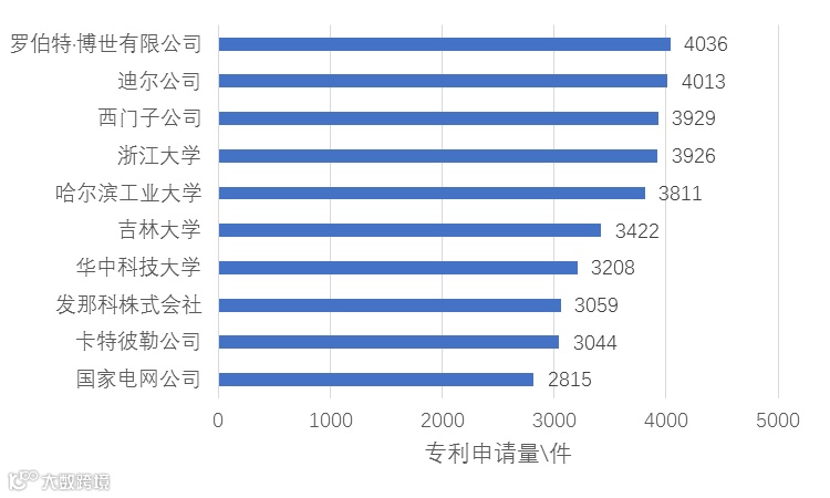图3所示为智能制造装备产业技术领域在全球范围内的申请人排名情况。由图可见,主要申请人中,跨国企业和科研院校占了很大的比重。排名前三的都是外国跨国企业,分别是德国的罗伯特·博世有限公司、美国的迪尔公司和德国的西门子公司。我国有四所高校(浙江大学、哈尔滨工业大学、吉林大学和华中科技大学)和1家企业(国家电网公司)上榜。总体来看,上榜申请人的专利申请量相差无几,可见各个申请人之间的竞争程度十分激烈。