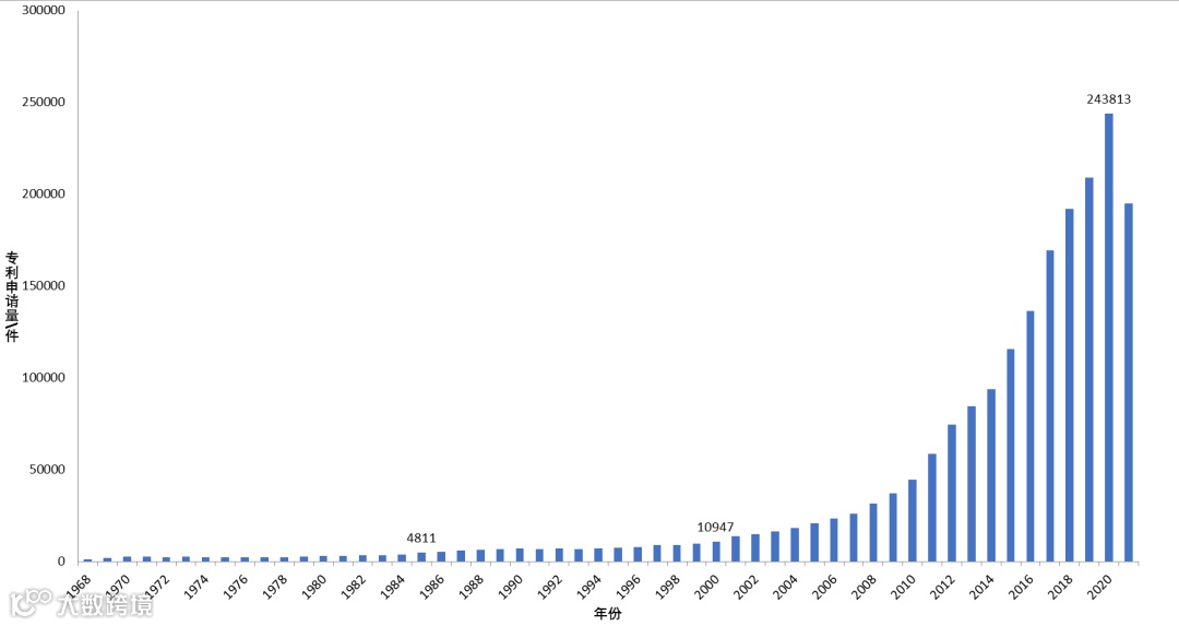 对全球智能制造装备的相关专利进行检索(截止至2022年5月10日),得到1,993,800件专利申请,对上述专利申请进行分析,可获得该技术领域的宏观发展状况。图1所示为智能制造装备产业的全球专利申请趋势。由图可知,该技术的发展可以分为3个阶段:1968-1985年为专利技术布局的萌芽阶段,增速不明显,且年申请量均未超过4,000件;1985-2000年为专利技术的缓慢增长阶段,年申请量在4,000-10,000件之间;2000至今为高速增长阶段,并在2001年年申请量突破10,000件、2015年年申请量突破100,000件年,其中2020年达到目前专利申请量的最高值243,813件(因专利申请存在审查周期,因此2021年和2022年的实际数据比当前数量要多)可见,从专利申请的时间和数量来看,智能制造装备产业现阶段已进入快速发展阶段,可以预计专利申请量将进一步增加。