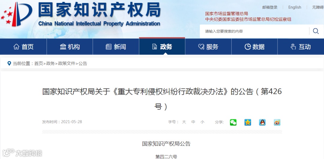 为认真贯彻落实党中央、国务院关于全面加强知识产权保护的决策部署,切实维护公平竞争的市场秩序,保障专利权人和社会公众的合法权益,依法依规办理在全国有重大影响的专利纠纷行政裁决案件,根据《中华人民共和国专利法》和有关法律、法规、规章,国家知识产权局制定《重大专利侵权纠纷行政裁决办法》。现予发布,自2021年6月1日起施行。