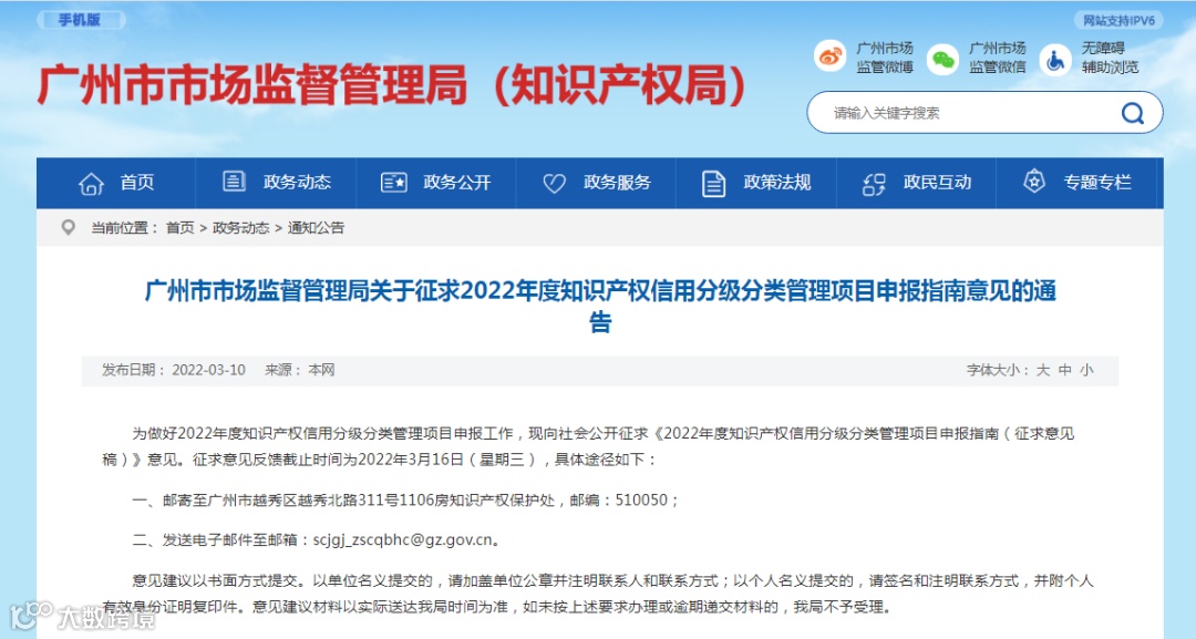 为做好2022年度知识产权信用分级分类管理项目申报工作,现向社会公开征求《2022年度知识产权信用分级分类管理项目申报指南(征求意见稿)》意见。征求意见反馈截止时间为2022年3月16日(星期三),具体途径如下: