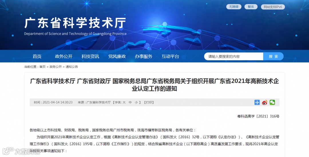 2021年我省高企认定申报在省科技业务管理阳光政务平台(网址:http://pro.gdstc.gd.gov.cn/egrantweb/,以下简称“省阳光政务平台”)开展,全年分3批次受理,每家企业只能申报1次。申报模块开放申报时间自2021年4月16日起。