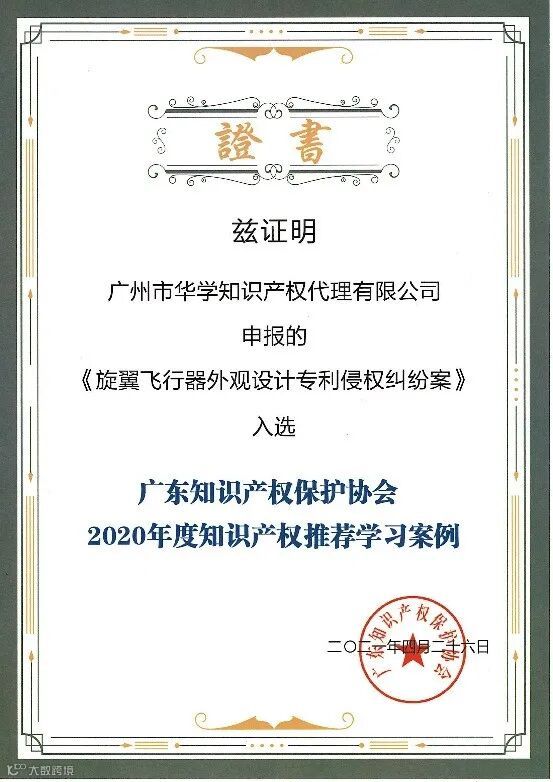 公司股东黄磊、梁莹、专利事业部总经理助理梁睦宇及相关专利代理师参加广东知识产权保护协会举办的“广东知识产权保护协会2020年度知识产权典型案例报告会”线上及线下活动。报告会中,评选出了“广东知识产权保护协会2020年度知识产权典型案例15件”。其中,华学申报的《旋翼飞行器外观设计专利侵权纠纷案》入选“2020年度知识产权推荐学习案例”。
