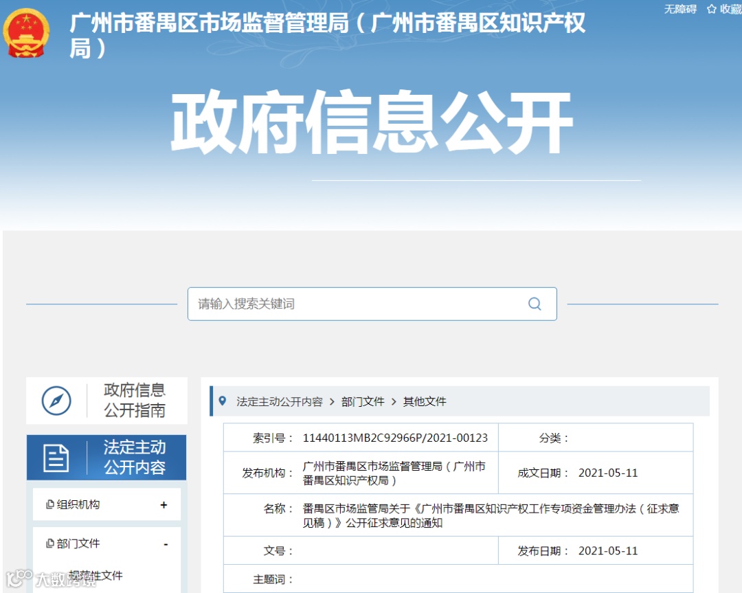 根据《广州市番禺区人民政府关于印发广州市番禺区实施〈广州市行政规范性文件管理规定〉细则的通知》(番府〔2013〕141号)和广州市司法局规范性文件审查流程的有关规定,现将我局草拟的《广州市番禺区知识产权工作专项资金管理办法(征求意见稿)》再一次公开征求社会公众意见。如有意见和建议,请于2020年6月11日前联系我局知识产权管理科。