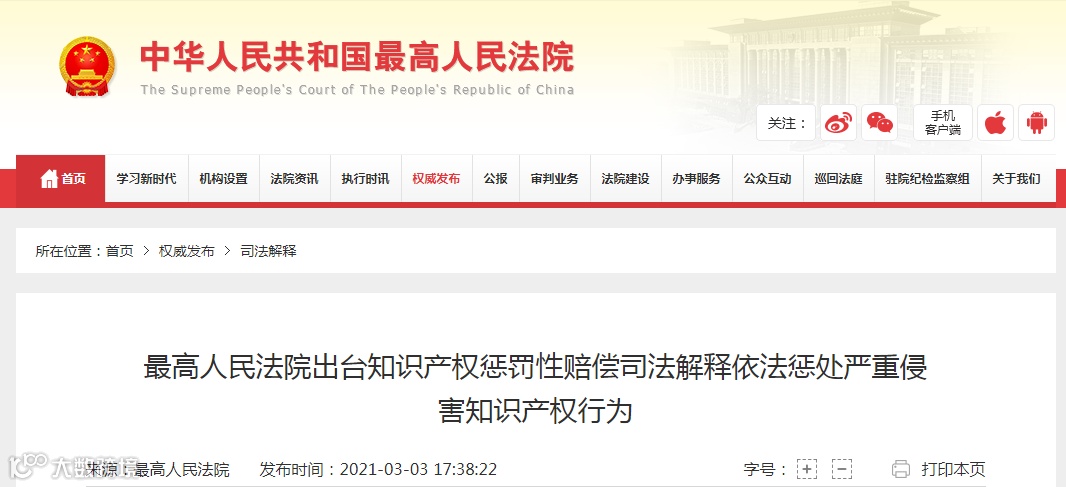 2021年3月3日,最高人民法院发布《最高人民法院关于审理侵害知识产权民事案件适用惩罚性赔偿的解释》(以下简称《解释》)。