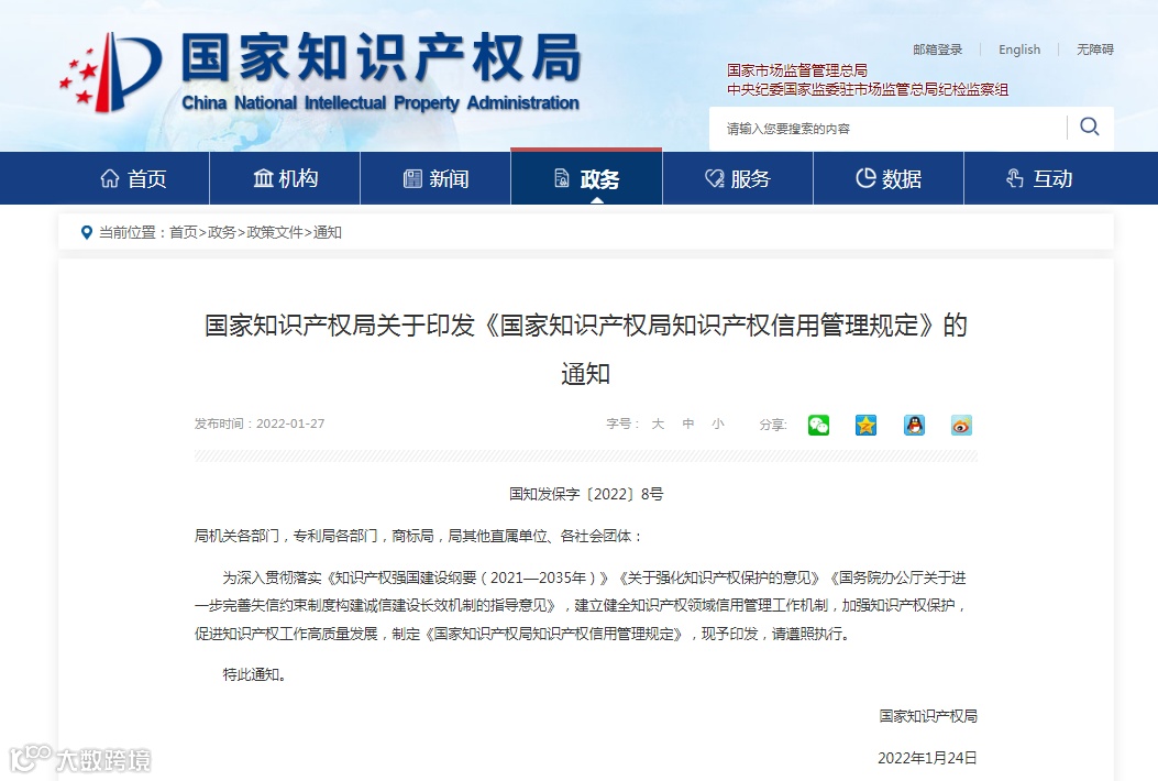 为深入贯彻落实《知识产权强国建设纲要(2021—2035年)》《关于强化知识产权保护的意见》《国务院办公厅关于进一步完善失信约束制度构建诚信建设长效机制的指导意见》,建立健全知识产权领域信用管理工作机制,加强知识产权保护,促进知识产权工作高质量发展,制定《国家知识产权局知识产权信用管理规定》,现予印发,请遵照执行。