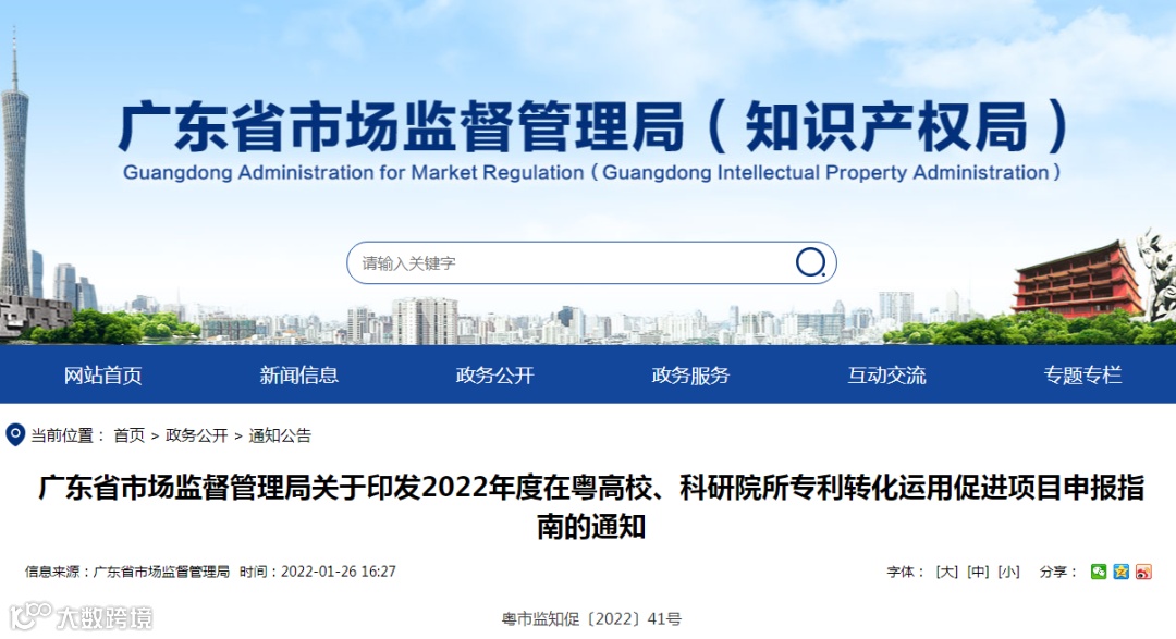 为全面提高我省专利转化实施效率,根据《财政部办公厅 国家知识产权局办公室关于实施专利转化专项计划 助力中小企业创新发展的通知》(财办建〔2021〕23号)、《广东省落实专利转化专项计划 助力中小企业创新发展的实施方案(2021—2023年)》及《广东省省级财政专项资金管理办法(试行)》《广东省省级财政资金项目库管理办法(试行)》的相关要求,我局制定了2022年度在粤高校、科研院所专利转化运用促进项目申报指南(见附件,以下简称申报指南)。现印发给你们,并将有关申报事项通知如下: