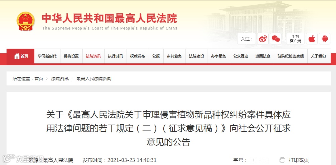 为加强植物新品种权司法保护,依法保障种业科技创新,最高人民法院起草了《最高人民法院关于审理侵害植物新品种权纠纷案件具体应用法律问题的若干规定(二)(征求意见稿)》。现通过最高人民法院政务网、中国法院网、最高人民法院官微、人民法院报新媒体等向社会公开征求意见,欢迎社会各界人士通过信件(包括中国邮政EMS)或者电子邮件方式提出意见和建议,意见反馈截止日期为2021年4 月15日。