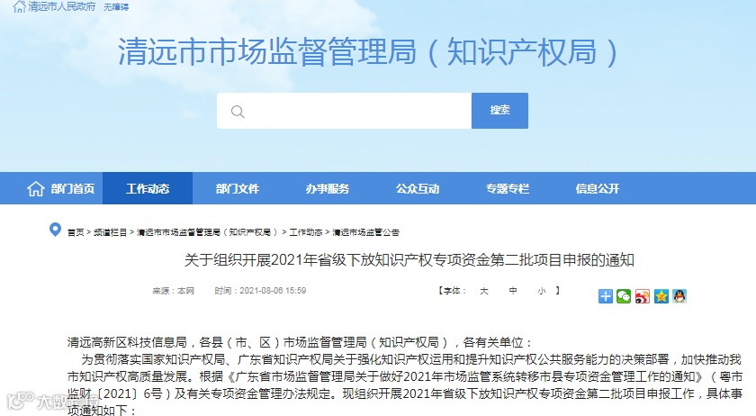 为贯彻落实国家知识产权局、广东省知识产权局关于强化知识产权运用和提升知识产权公共服务能力的决策部署,加快推动我市知识产权高质量发展。根据《广东省市场监督管理局关于做好2021年市场监管系统转移市县专项资金管理工作的通知》(粤市监财〔2021〕6号)及有关专项资金管理办法规定。现组织开展2021年省级下放知识产权专项资金第二批项目申报工作,具体事项通知如下: