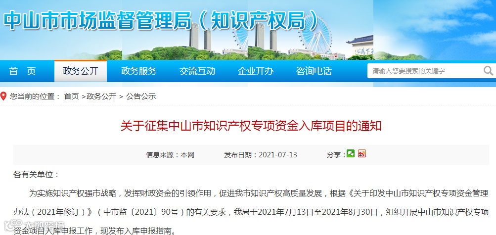 为实施知识产权强市战略,发挥财政资金的引领作用,促进我市知识产权高质量发展,根据《关于印发中山市知识产权专项资金管理办法(2021年修订)》(中市监〔2021〕90号)的有关要求,我局于2021年7月13日至2021年8月30日,组织开展中山市知识产权专项资金项目入库申报工作,现发布入库申报指南。