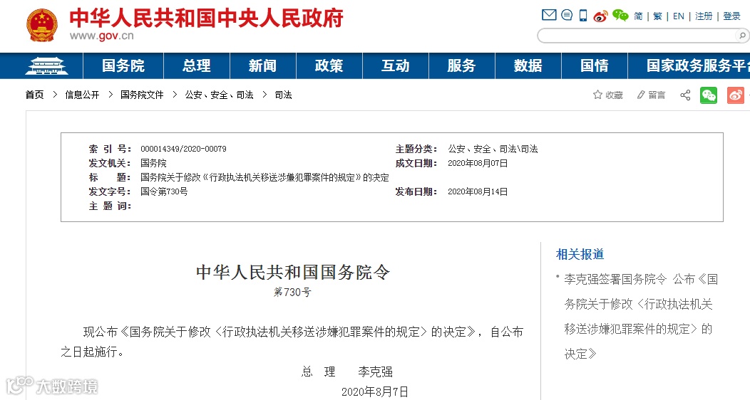 现公布《国务院关于修改〈行政执法机关移送涉嫌犯罪案件的规定〉的决定》,自公布之日起施行。