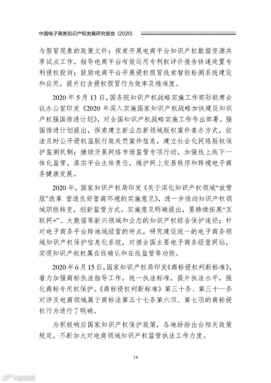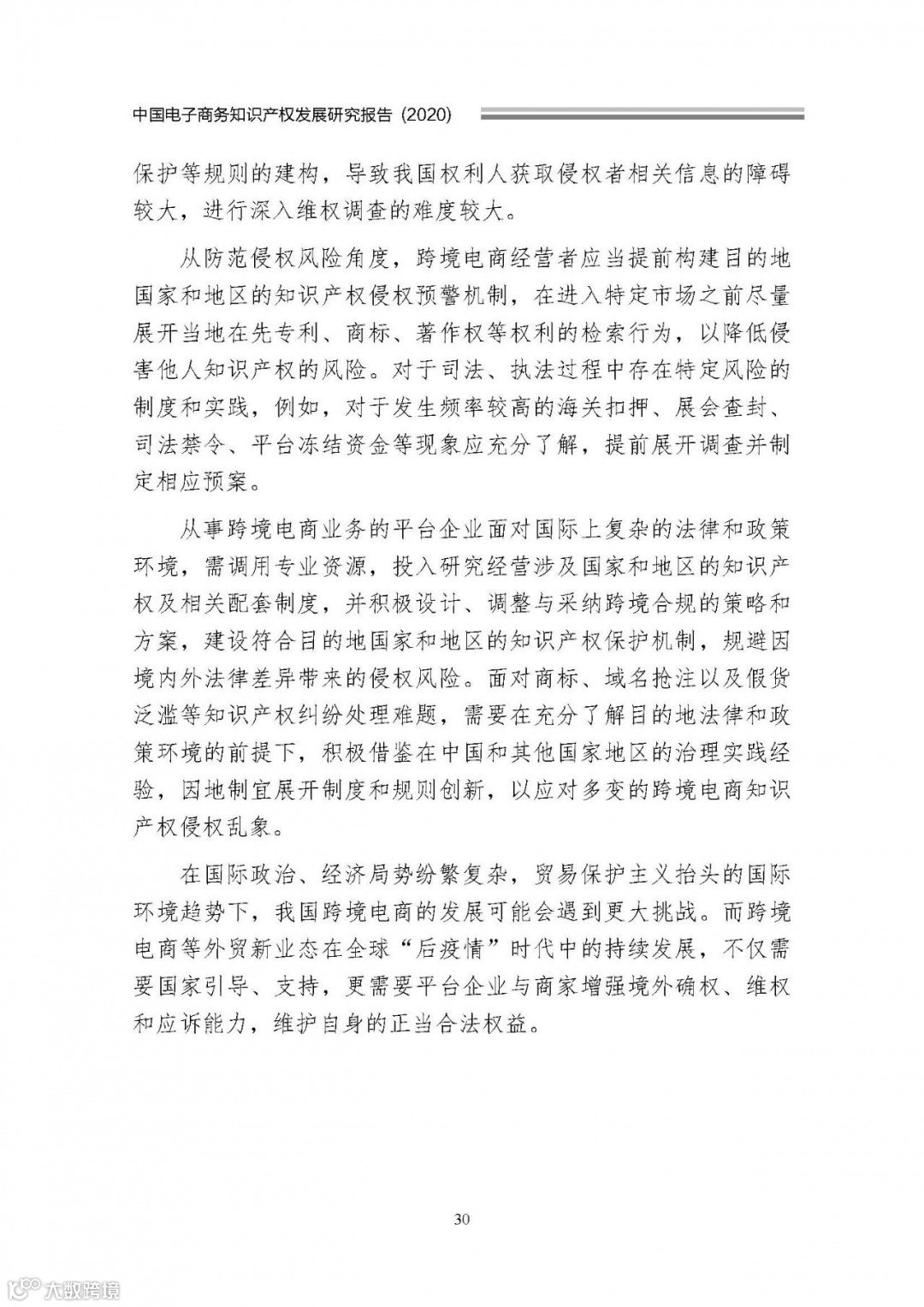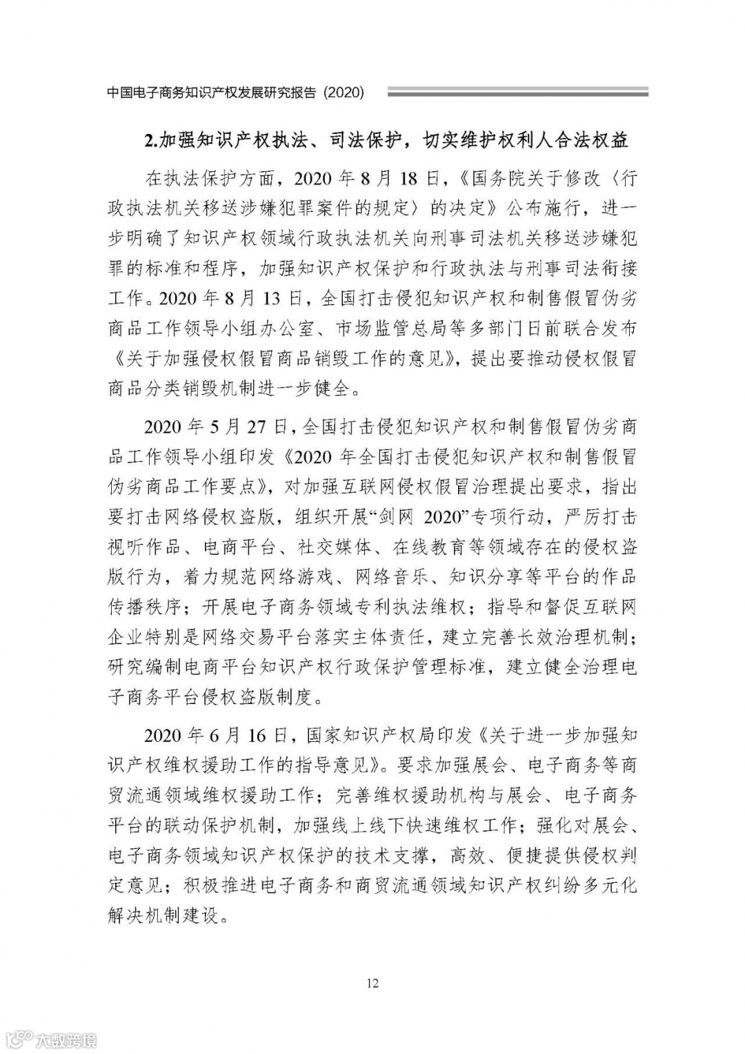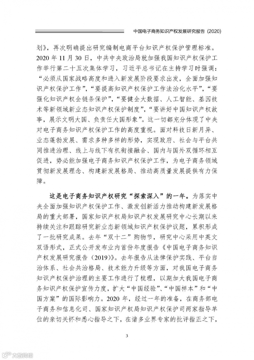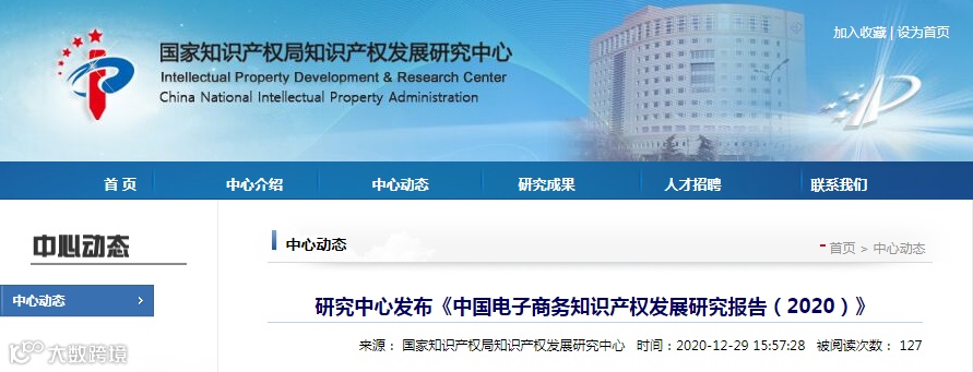 12月28日,研究中心召开《中国电子商务知识产权发展研究报告(2020)》发布会。报告全面展现2020年中电子商务知识产权的发展与探索。研究显示,2020年我国电子商务领域知识产权保护持续发力、全面强化、成效显著,为推动高质量发展提供有力保障。