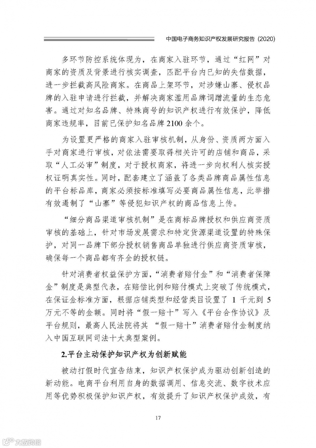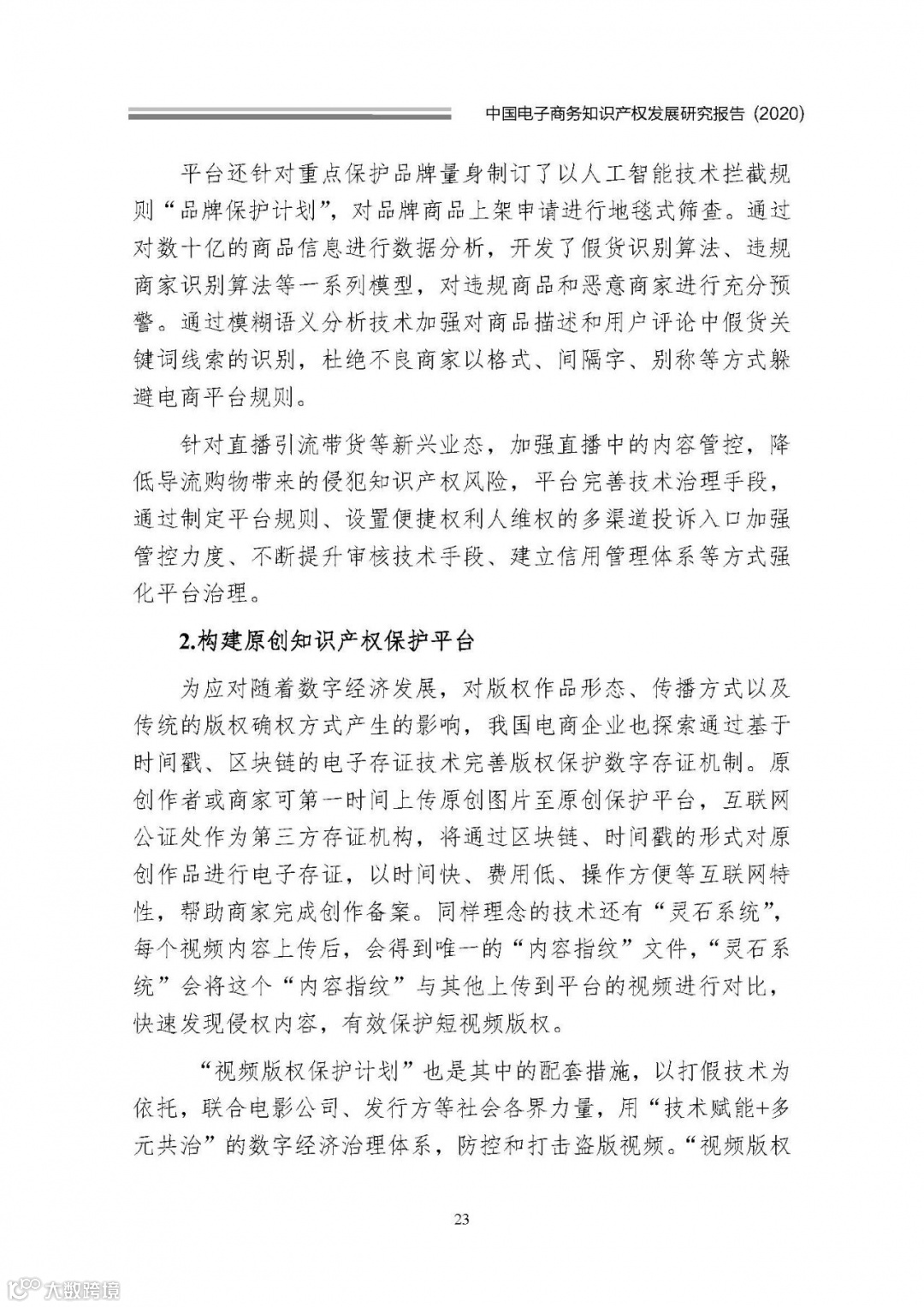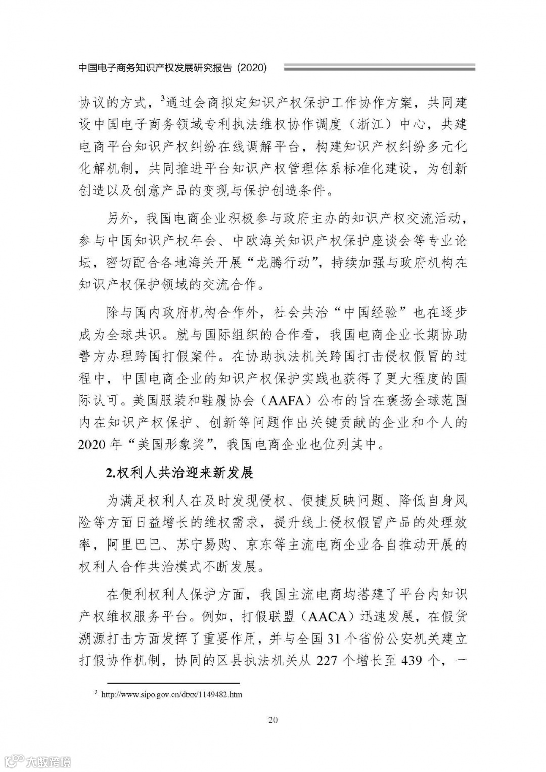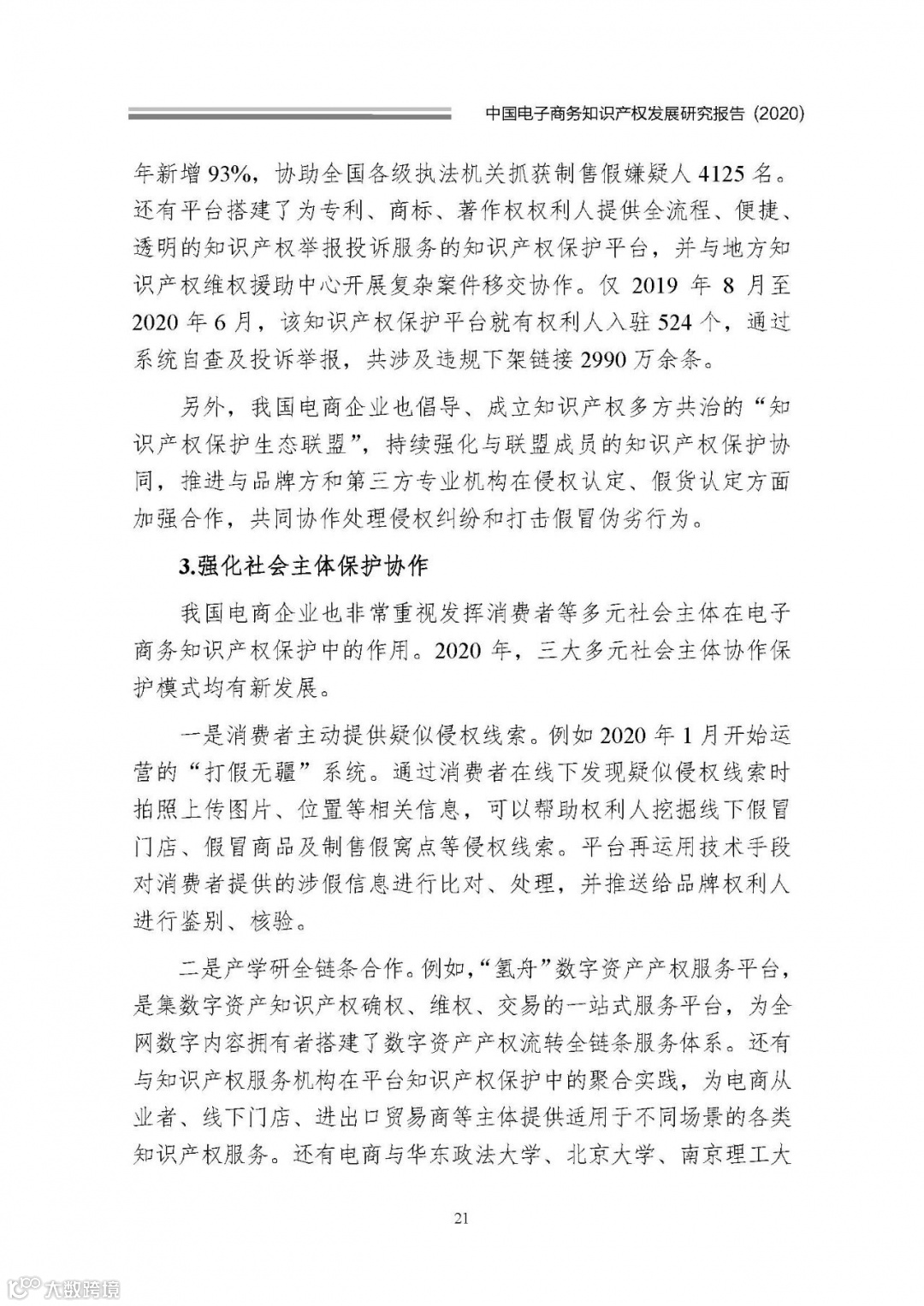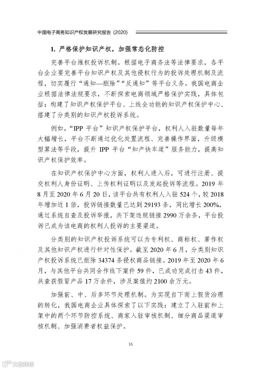 二是平台治理。2020年,各平台企业切实履行平台义务,细化平台内知识产权保护管理,各大电商平台知识产权权利人入驻数量不断提升。例如,阿里巴巴集团知识产权保护平台(简称IPP平台)设置更严格的商家入驻审核机制,从身份、资质两方面入手对商家进行审核,对依法需要取得相关许可的店铺和商品,采取“人工必审”制度,96%的知识产权投诉在24小时内被处理。